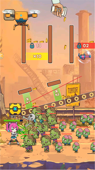 1、利用轨道上的×10倍数加成射击僵尸,借助无人机辅助,提升伤害快速清敌。