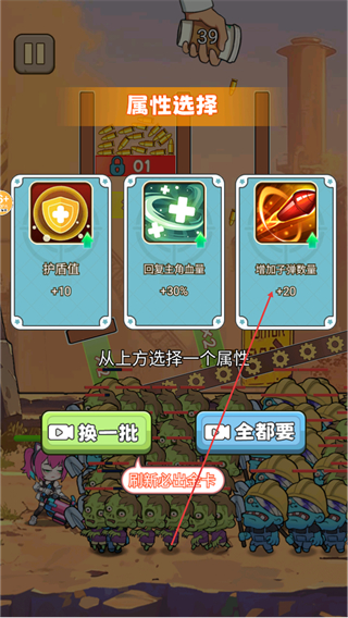 4、在属性选择界面选属性强化角色,继续借助增益射击僵尸,推进关卡。