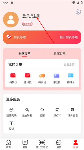 2、在个人页面,点击登录/注册的选项,进入登录页面。