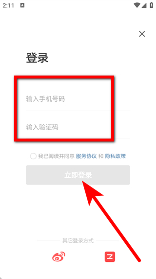 3、在登录页面,输入手机号码和获取验证码,勾选后,点击立即登录,完成账号登录。