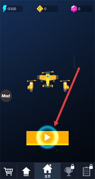 1、在游戏主页,点击黄色播放按钮,进入关卡选择界面,准备开启飞行射击挑战。