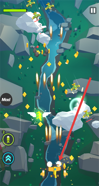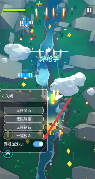4、开启倍速后,滑动屏幕控制飞机移动,躲避障碍、收集道具,击败所有敌方飞机完成通关。