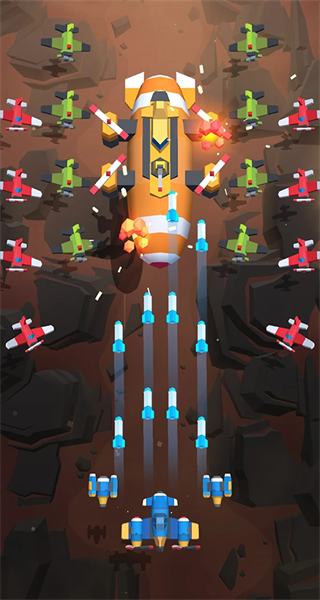 采用唯美3D建模,战机细节与爆炸特效精致立体,背景场景层次丰富,竖版界面适配手机操作,弹幕视觉冲击强烈,完美还原经典飞行射击的沉浸感。