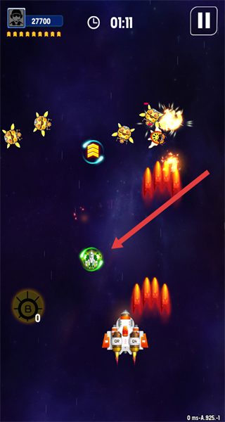 3、战斗过程中,拾取箭头指向的道具,触发强化弹幕效果,提升战机的火力输出,高效消灭敌方单位。