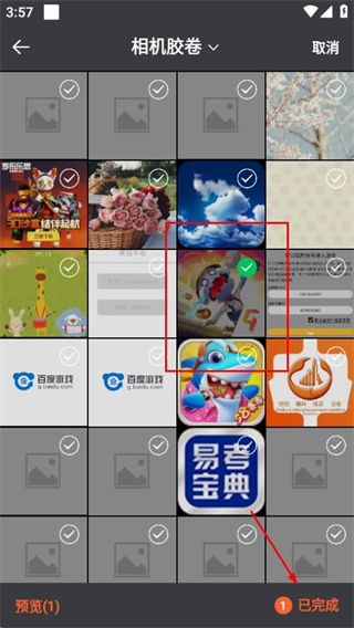 3、在相机胶卷页面,选择目标图片后点击已完成按钮,可进入切图制作页面。