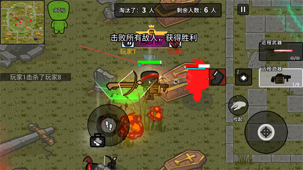 3、持续攻击敌人,累计淘汰数,逐步清空战场剩余对手。