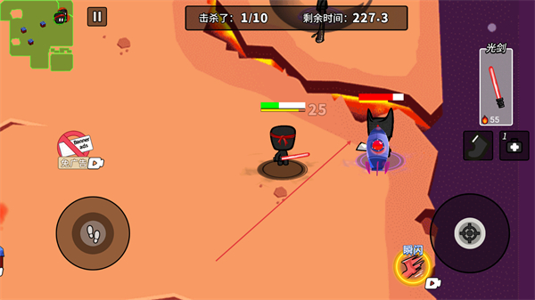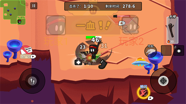 1、操控角色用木棒攻击敌人,以击杀10人为目标,推进对局进度。