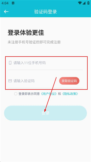 3、在验证码登录页面,填写手机号码,填写对应的验证码后,完成登录。
