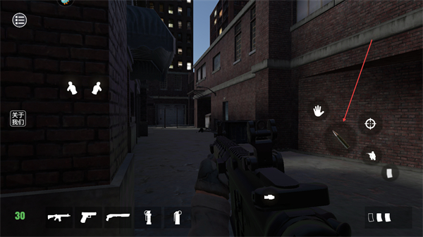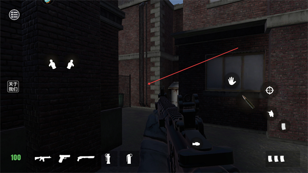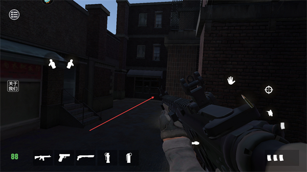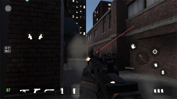 1、操控角色在巷战场景移动,利用砖墙作掩体,观察周围,借助激光瞄准目标,准备射击。