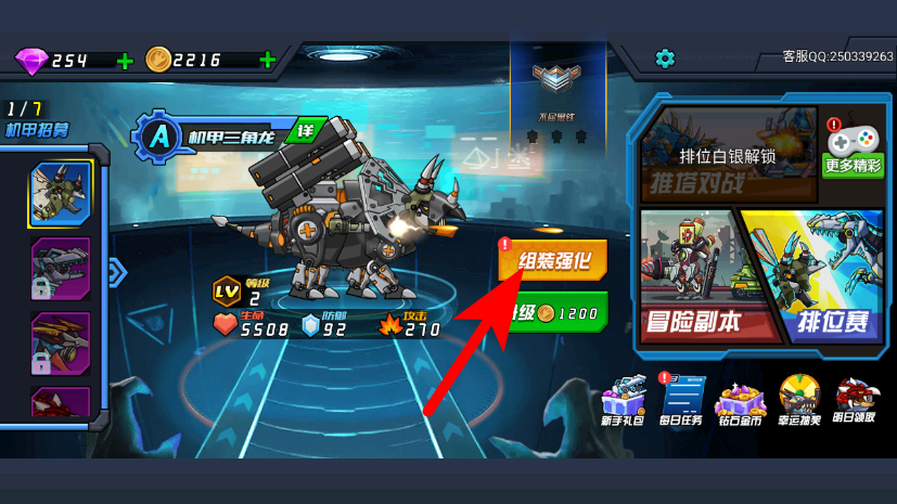 1、在机甲三角龙界面,点击组装强化按钮,进入对应操作页面。