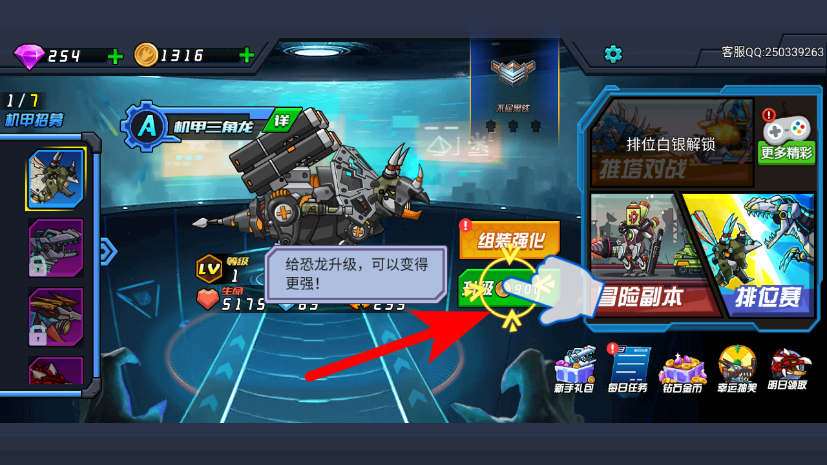 3、搭配完成后点击升级按钮,消耗金币提升机甲三角龙等级。
