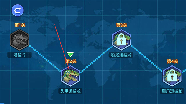 1、在关卡地图界面,点击第2关对应的头甲迅猛龙关卡入口,即可进入该关卡的战斗环节推进游戏进程。