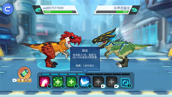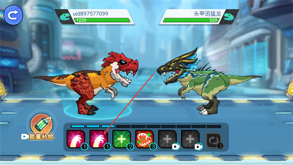 战斗采用直观的技能释放机制,点击图标即可触发攻击与技能,搭配酷炫的战斗特效与震撼的打击感,还原机甲恐龙对决的热血氛围。不同机甲恐龙存在属性克制。