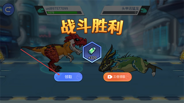 4、成功击败头甲迅猛龙后,界面显示战斗胜利点击领取按钮,即可获取该关卡对应的奖励道具。