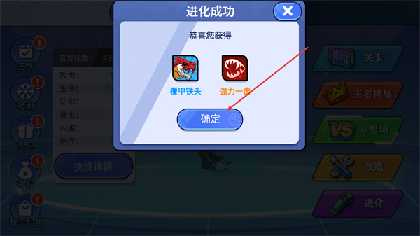 4、进化成功后弹出的奖励面板中会获得覆甲铁头和强力一击,点击确定按钮即可领取奖励并关闭面板。