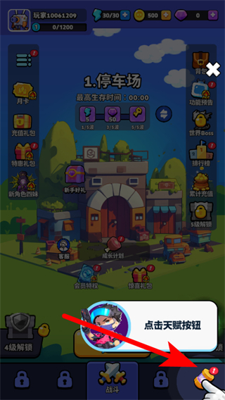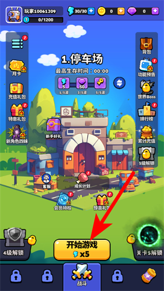 3、返回主界面后点击开始游戏按钮,消耗对应资源进入1.停车场关卡的战斗。