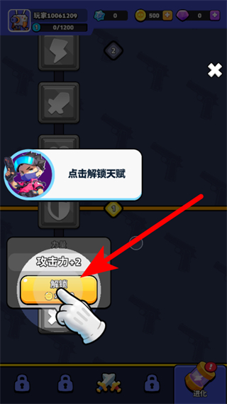 2、在天赋界面点击解锁按钮,解锁攻击力+2的力量类天赋,增强角色战斗属性。