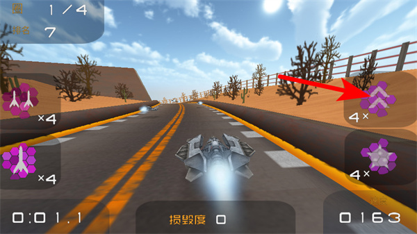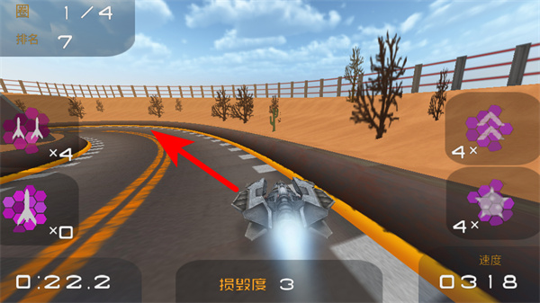 4、按箭头指引操控飞机转向过弯,避免冲出赛道增加损毁度,保持稳定行驶以推进竞速关卡的完成进度。