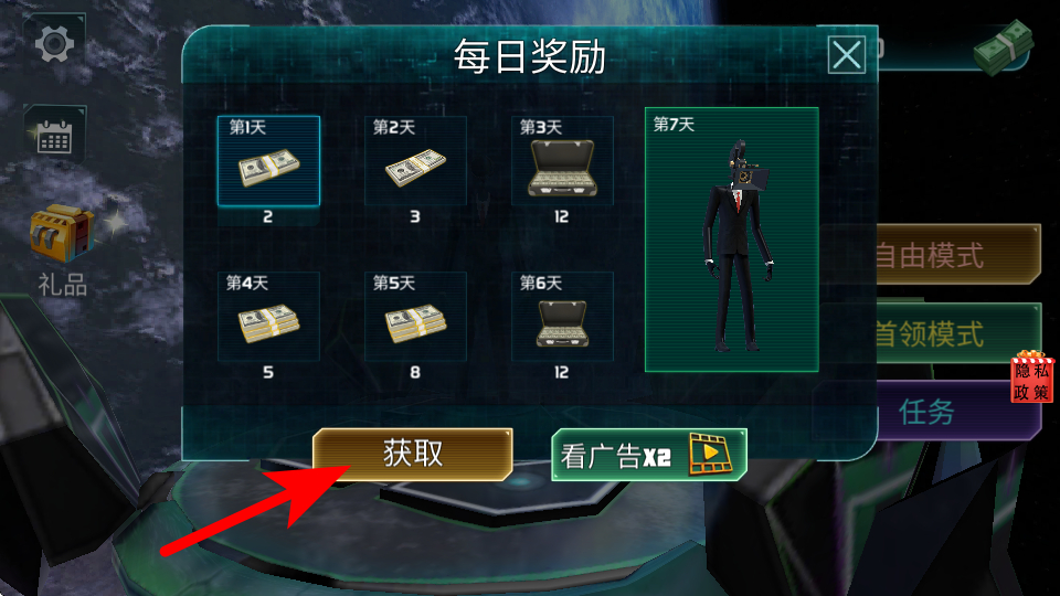 1、进入游戏界面后,点击获取按钮领取每日奖励,这是获取资源的关键操作,点击才能拿到对应的金币或道具。