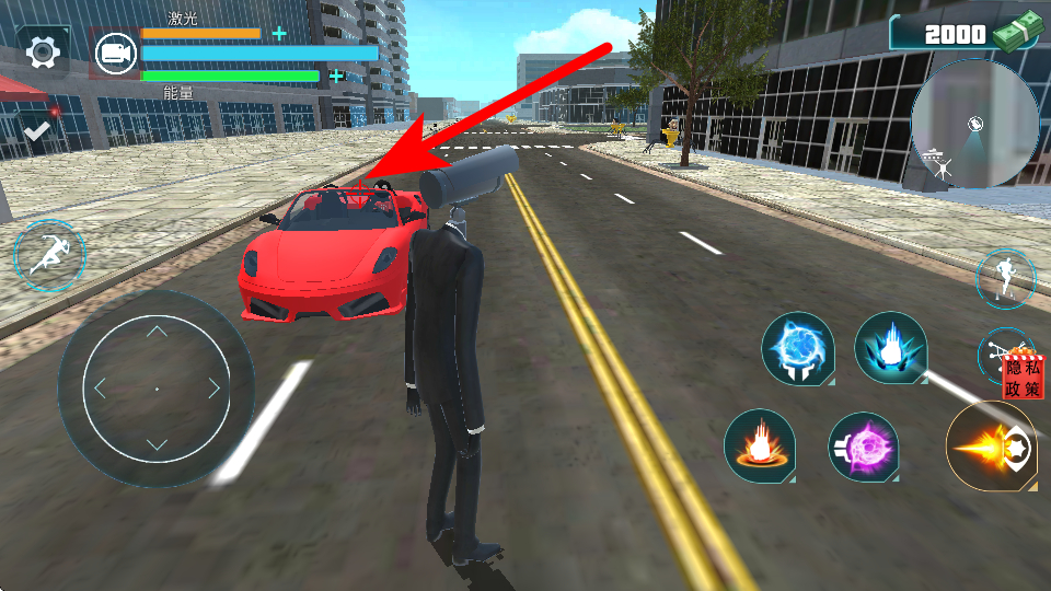 3、紧跟红色箭头指引,靠近场景中的目标物体如车辆,触发互动或战斗流程,推进关卡的任务进度。