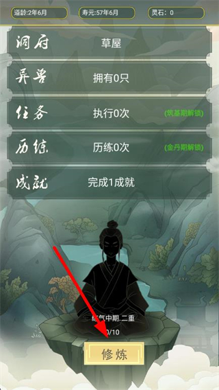 4、点击修炼开始修仙,积累修为提升修仙境界。