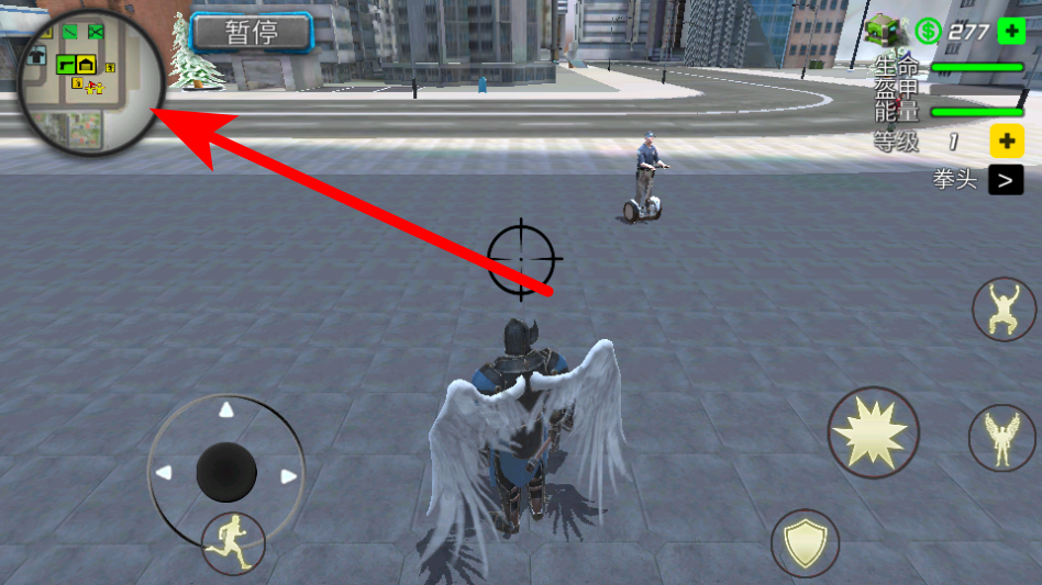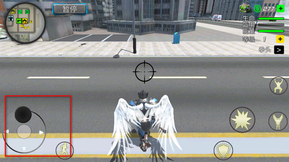 3、通过左侧虚拟摇杆操控角色在城市场景中移动,前往地图标注的目标区域。