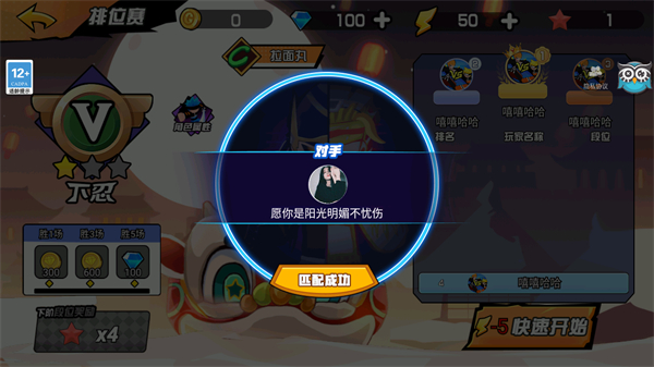 3、进入排位赛界面,选择当前拉面丸角色,点击快速开始参与排位对战,胜场可获取钻石等对应奖励。