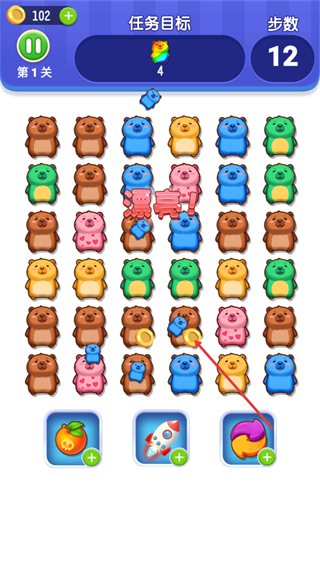 2、在第1关消除关卡中,拖动相同的粉色小熊连线消除,积累进度以完成收集12个彩色小熊的任务目标。