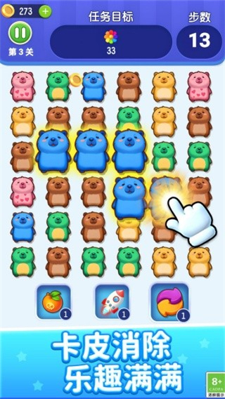 以当下热门的卡皮巴拉为核心元素,设计多款不同肤色、神态呆萌的形象,每只卡皮巴拉的消除动作都鲜活有趣,强化萌系消除的欢乐感,吸引喜欢萌宠元素的人群。