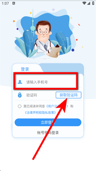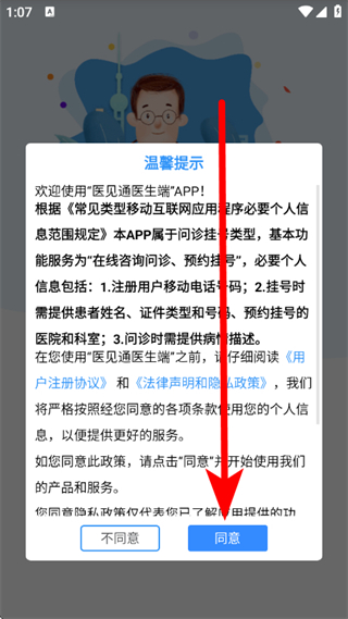 1、打开医见通,在温馨提示弹窗中,点击同意,进入登录页面。