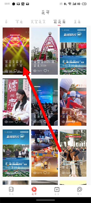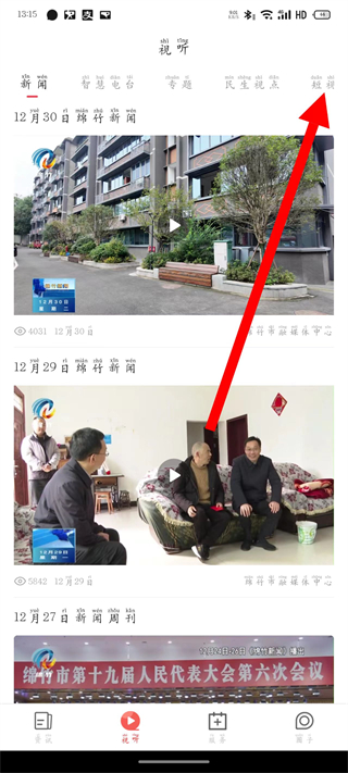 2、在视听页面,点击短视频标签,进入短视频内容列表页面。