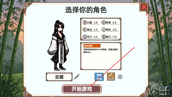2、在选择你的角色界面,选定角色云瑶后,确认其属性与御本还真技能,点击开始游戏即可进入游玩。