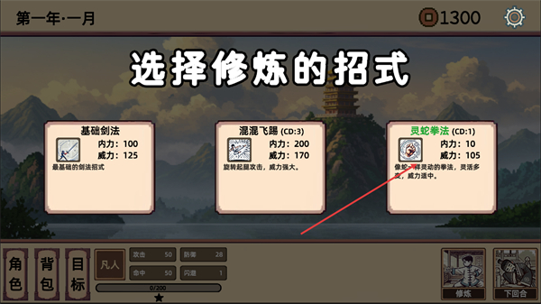 4、处于选择修炼的招式界面,可从基础剑法等招式里选其一,进行修炼来提升角色的战斗能力。