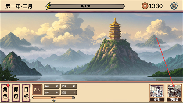 3、当前处于游戏进程界面,可点击修炼提升角色能力,或点击下回合推进游戏时间,同时查看角色属性。