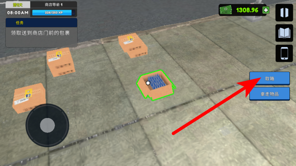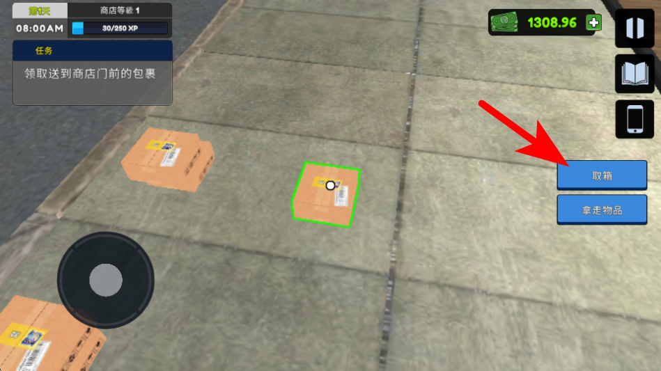 4、按箭头指引,再次点击取箱按钮领取剩余包裹,继续完成任务要求,补充更多店铺经营所需的商品。
