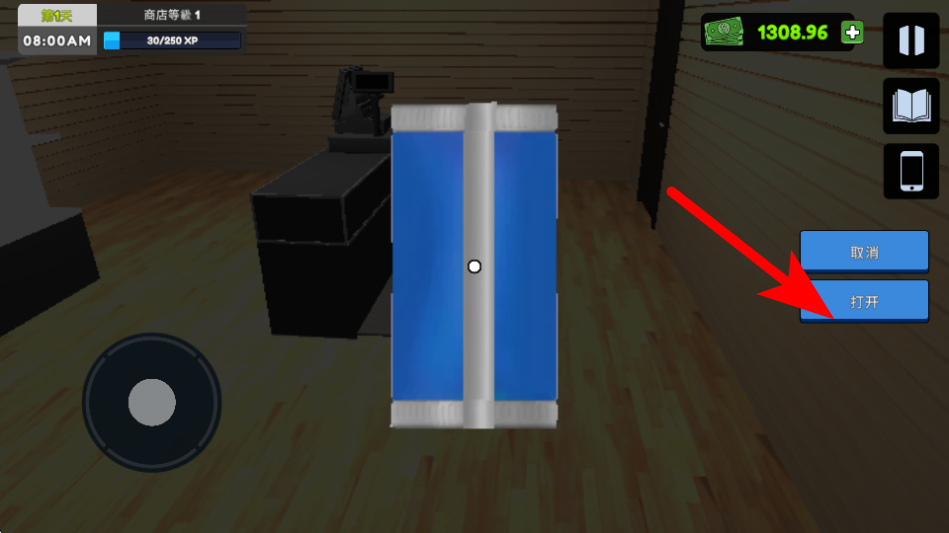 2、游戏中依照箭头指引,点击打开按钮开启领取的包裹,朝着获取包裹内商品的目标前进,推进店铺的货源补充流程。
