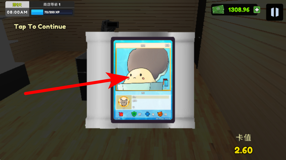 3、紧跟红色箭头指引,点击卡牌界面完成包裹开箱后的交互,确认获取的卡牌道具,为后续店铺经营积累商品资源。
