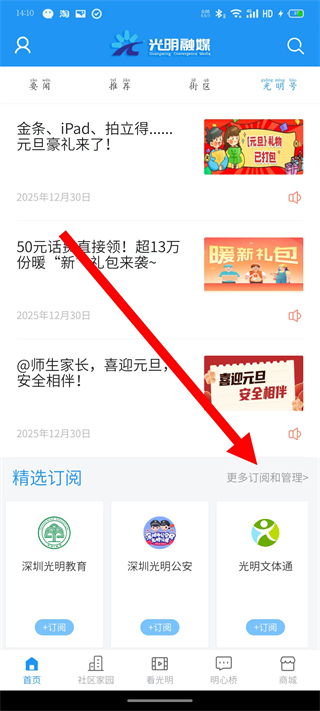 2、在光明号页面,点击更多订阅和管理,进入订阅管理页面。