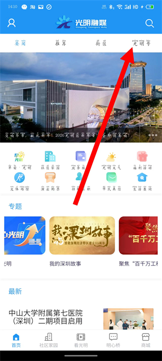 1、在光明融媒页面,点击顶部光明号,进入光明号页面。