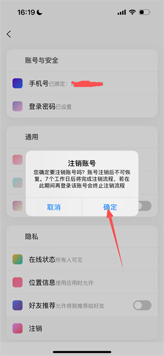 4、在注销弹窗中,点击确定按钮,即可完成账号注销操作。