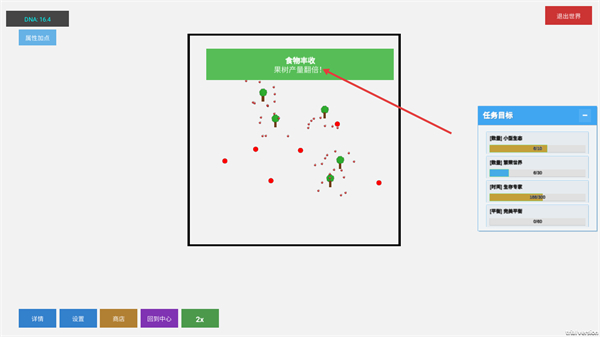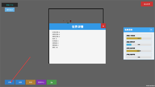 1、点击左下角详情按钮,打开世界详情界面,可查看当前世界里红色生物黄色生物等的数量,辅助了解当前生态的具体状态。