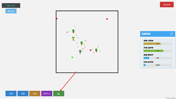 3、点击下方的4x倍速按钮,能加快游戏内时间流速,让生物互动资源变化等进程提速,更高效观察生态发展。