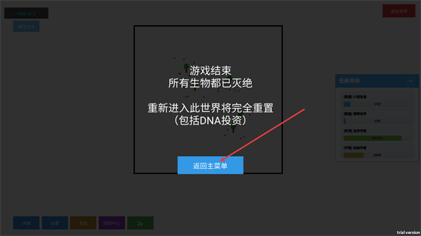 4、看到游戏结束所有生物都已灭绝提示后,点击返回主菜单按钮回到主界面,重新进入世界会重置所有内容需重新规划。