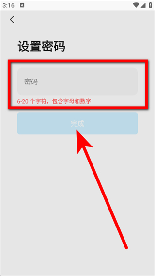 4、在设置密码页面,设置密码,点击完成,完成注册。