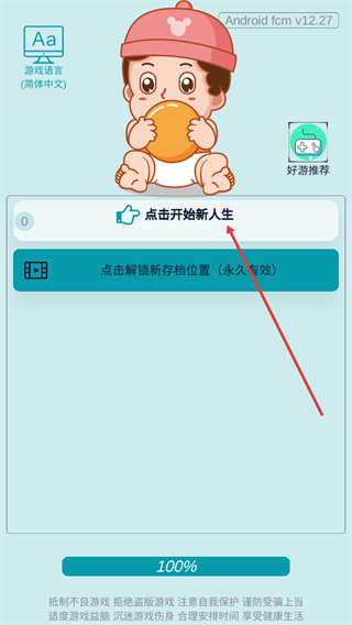1、在当前界面点击开始新人生按钮,即可开启人生模拟游戏,当前游戏语言已设置为简体中文可直接体验。