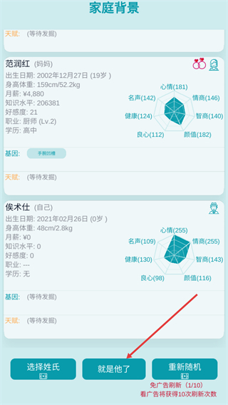 2、查看家庭背景中父母与自己的信息后,点击就是他了按钮,确认当前角色并进入人生模拟的后续流程。