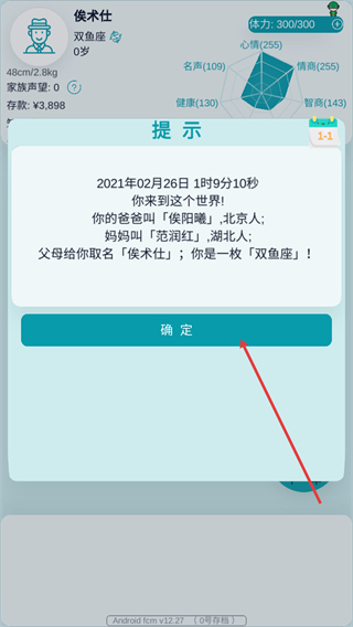 3、阅读提示里的角色初始信息包含父母信息、姓名等后,点击确定按钮关闭提示,继续推进人生模拟进程。