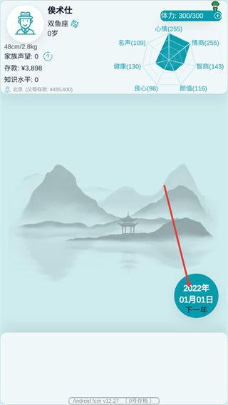 4、在角色信息界面中,点击2022年01月01日下一年按钮推进时间,同时可查看角色各项属性随时间的变化。