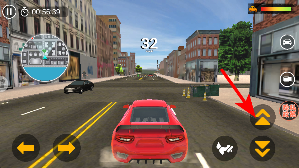 2、游戏中依照箭头指引,点击加速按钮提升车辆速度,朝着任务目标区域前进,注意观察路况避免碰撞。