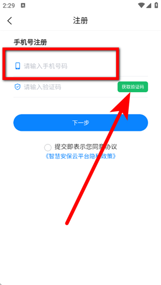 2、在手机号码注册页面,输入手机号码,点击获取验证码。